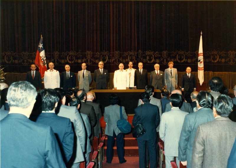 Público y autoridades de pie durante la ceremonia por los 35 años de la CChC. Se ven a distancia Germán Molina, Ignacio Rius, Jorge Bronfman, Augusto Pinochet, Ricardo García, Fernando Pérez y Hernán Büchi, entre otros.