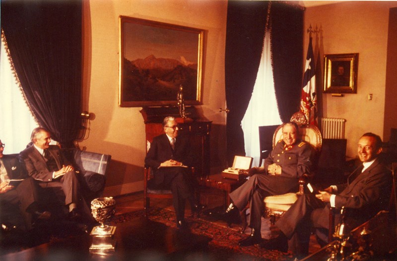Entrevista de la mesa directiva de la Cámara Chilena de la Construcción con el jefe de Estado el 24 de junio. Se ven sentados a Sergio Melo (primer vicepresidente), Jorge Bronfman (presidente CChC), Augusto Pinochet (jefe de Estado) y Miguel Ángel Poduje (Ministro de Vivienda).
