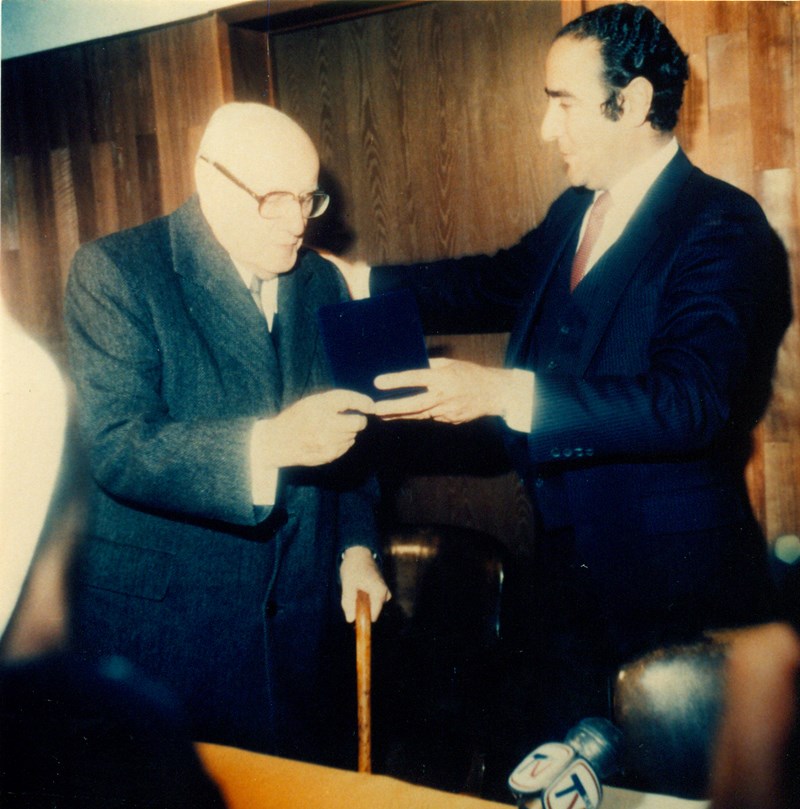 El ex presidente Jorge Alessandri recibiendo la Medalla de Oro por parte del presidente de la CChC, Máximo Honorato.