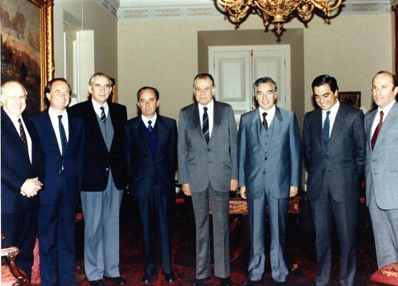 Mesa directiva de la Cámara chilena de la Construcción visita al presidente Patricio Aylwin en el palacio de La Moneda. En la imagen Carlos Hurtado (ministro OO.PP.), Alberto Etchegaray (Ministro de Vivienda), Sergio Melo (past presidente CChC), Patricio Aylwin (Presidente de la República), José Antonio Guzmán (Presidente CChC), Rodrigo Donoso (Vicepresidente CChC) y Blas Bellolio.
