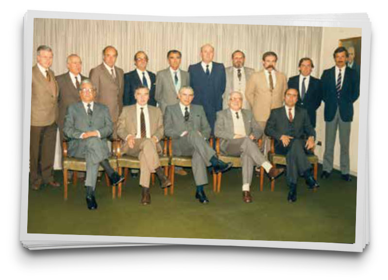 Directorio de la CChC 1987-1988. Se ven de pie a Otto Kunz, Enrique Costa, Guillermo Pérez-Cotapos, Mauricio Collado, Luis Smith, Guillermo Porter, Alberto Collados, Roberto Doggenweiler, Alfredo Silva y Kurt Reichards. Sentados se ve a Jorge Bronfman, José Antonio Guzmán, Sergio Melo, Fernando Pérez y Máximo Honorato.